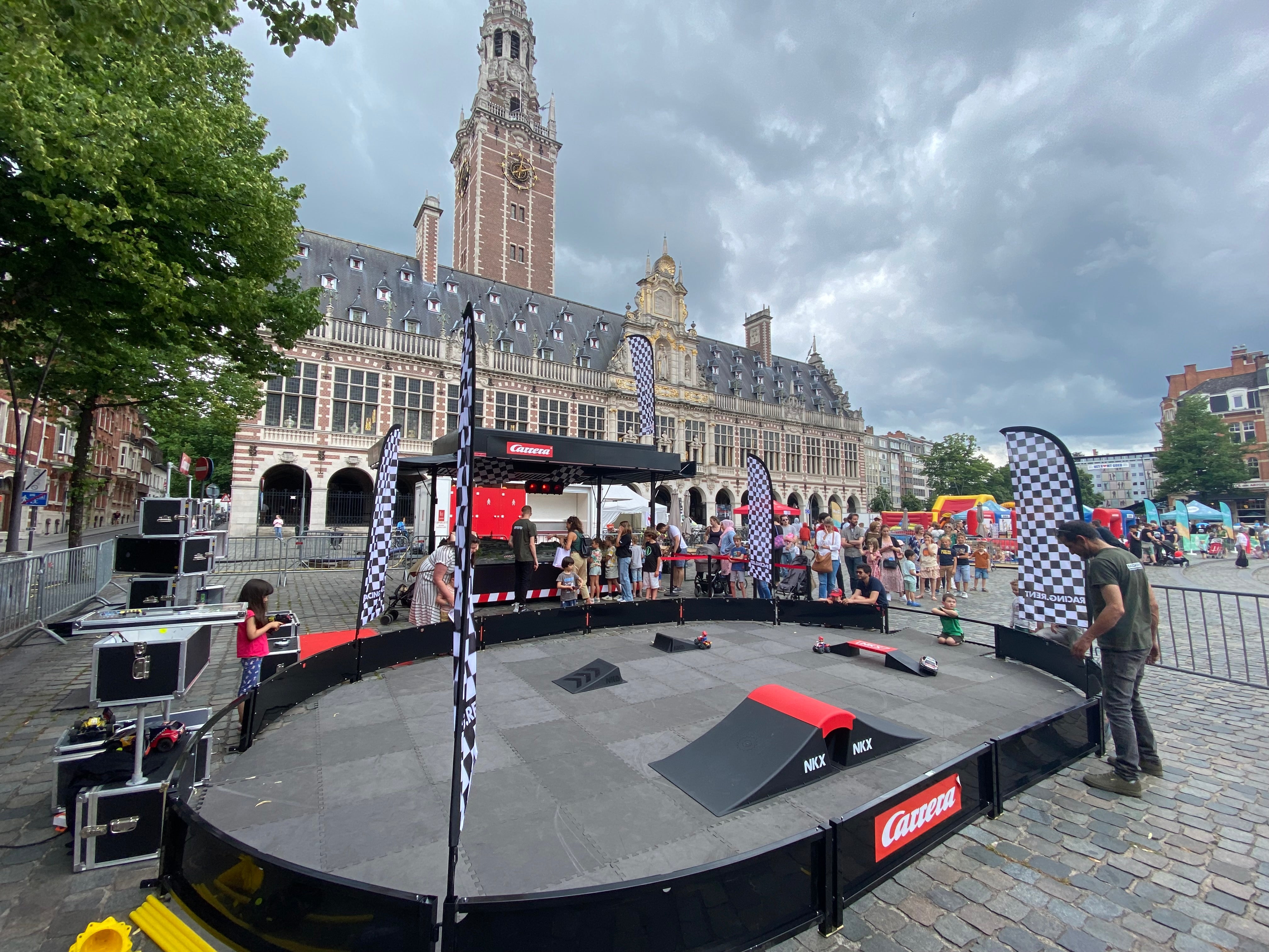 RC banen : de straatracebaan bestaat uit kunststof matten die als een puzzel in elkaar gelegd moet worden en de 4x4 baan zit gemonteerd op een uitklapbare kar .